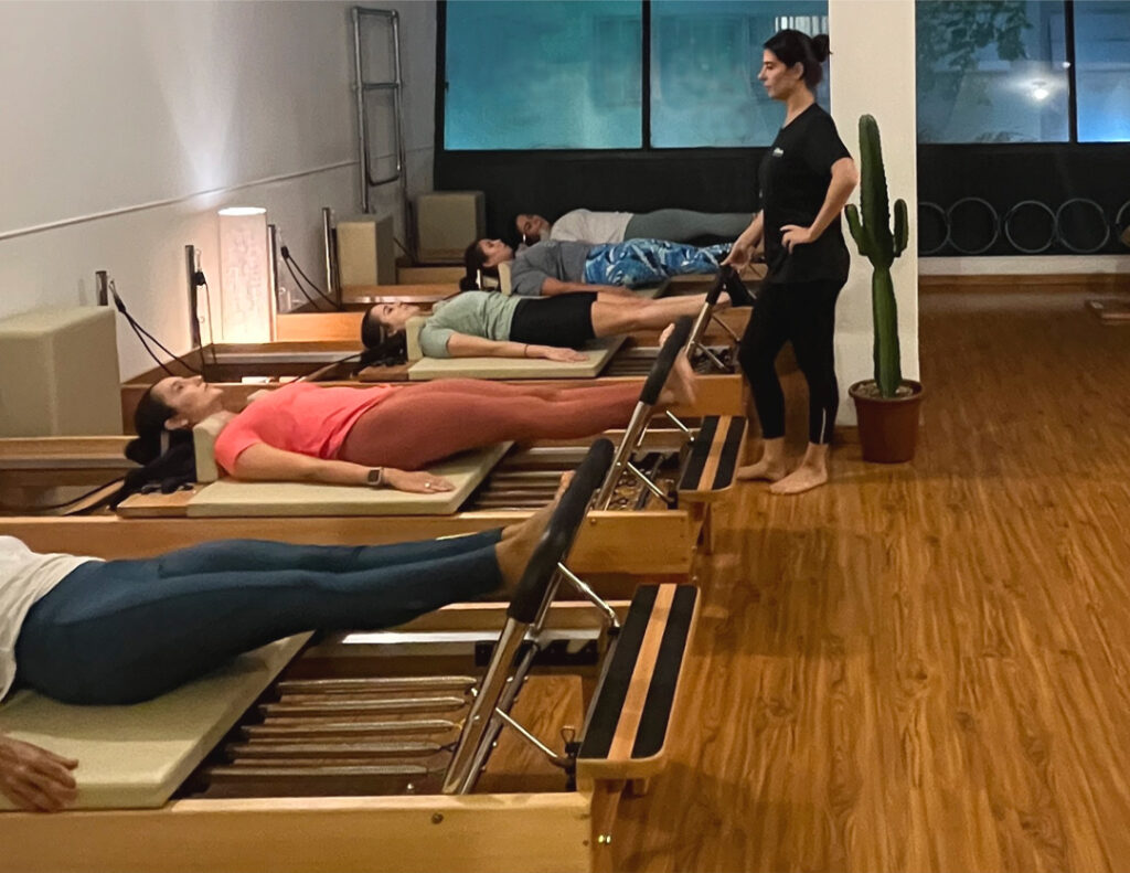 Todos os alunos seguem juntos o repertório original do Pilates Clássico, cada aula é detalhadamente projetada e fiel ao método original, com fluidez e energia.